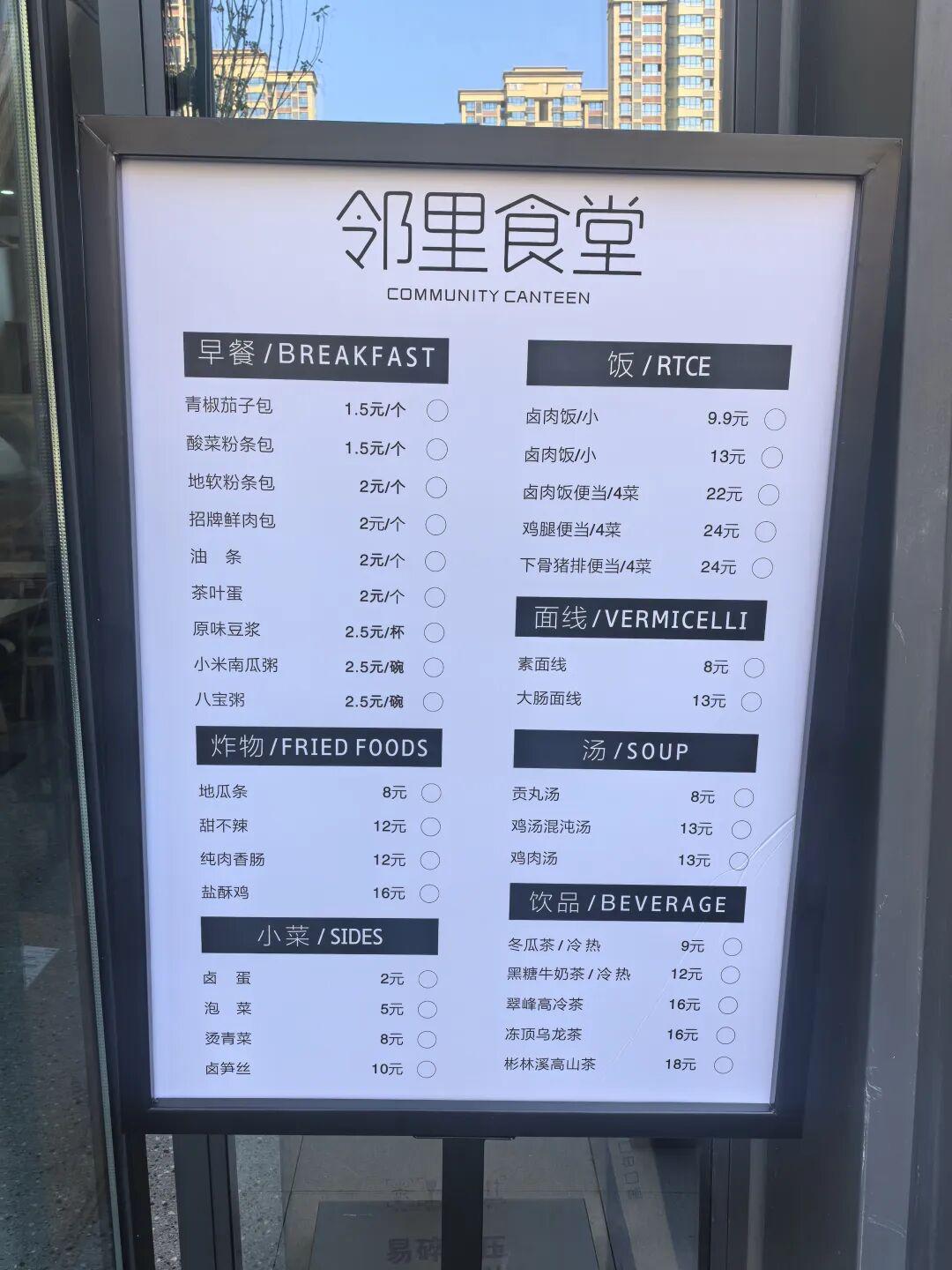 邻里食堂的产品也特别丰富,主要有早餐、炸物、小菜、饭、面线、汤和饮品七个大类,涵盖一日三餐的基本所有食谱。像早餐的包子、油条、豆浆、粥品、卤蛋等,像午餐的卤肉饭、卤肉便当、鸡腿便当、下骨猪排便当、素面线、大肠面线等。还有一些休闲炸物,像地瓜条、甜不辣、纯肉香肠、盐酥鸡。当然也不缺休闲饮品,有比较养生的冬瓜茶、黑糖牛奶茶、翠峰高冷茶、冻顶乌龙茶和彬林溪高山茶。价格也比较亲民,早餐基本5元吃饱,午餐晚餐9.9元吃到,15元吃饱。