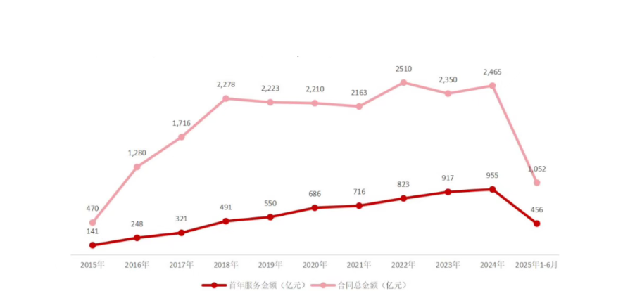 2025年上半年全国环卫服务项目公招口径成交年化总额456亿元,同比下降3%,创下近十年来最大跌幅。