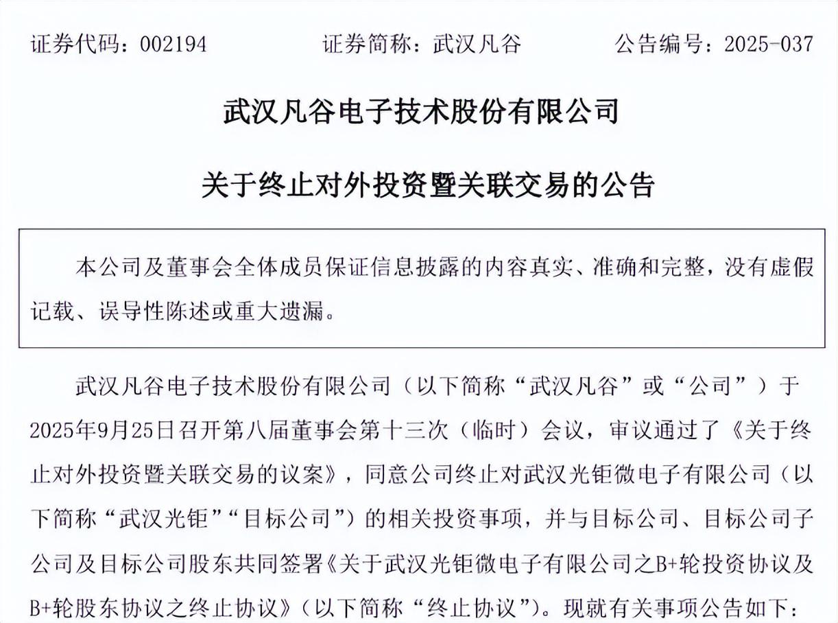 新业务拓展的受阻进一步加剧了经营压力。9月26日,武汉凡谷公告终止对武汉光钜微电子有限公司的B+轮投资,此前公司于2025年3月已签署相关投资协议,旨在切入射频前端芯片领域以拓展业务边界。对于终止原因,公司表示受境外政策波动及国内行业竞争加剧影响,武汉光钜经营环境发生变化,中长期发展不确定性上升,业绩扭亏面临挑战。