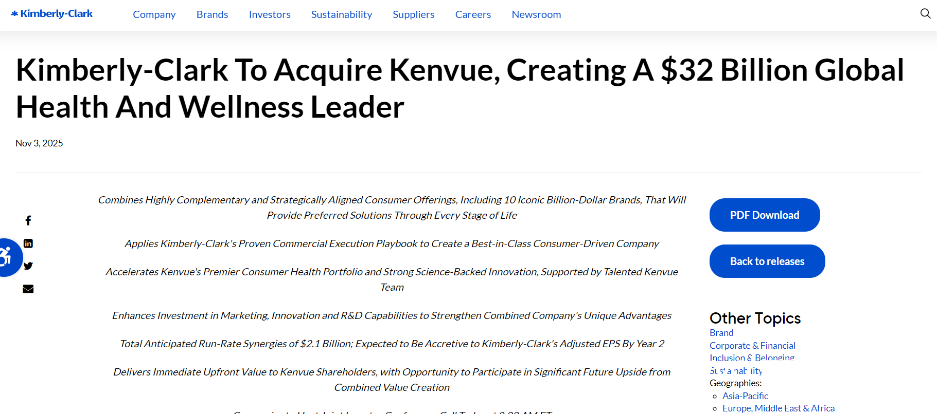11月3日,拥有舒洁、高洁丝等品牌的快消巨头金佰利(Kimberly-Clark)宣布将以487亿美元的价格收购另一快消巨头科赴公司(Kenvue),后者原为强生集团的消费品业务,拥有大宝、露得清、泰诺等知名品牌。