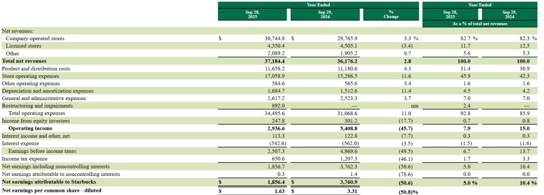 2025财年第四季度,星巴克的营业利润率降至2.9%,而去年同期为14.4%。