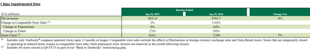单看第四季度(截至2025年9月28日),星巴克中国的营收达到8.316亿美元,同比增长6%;同店销售额同比增长2%,同店交易量同比增长9%。
