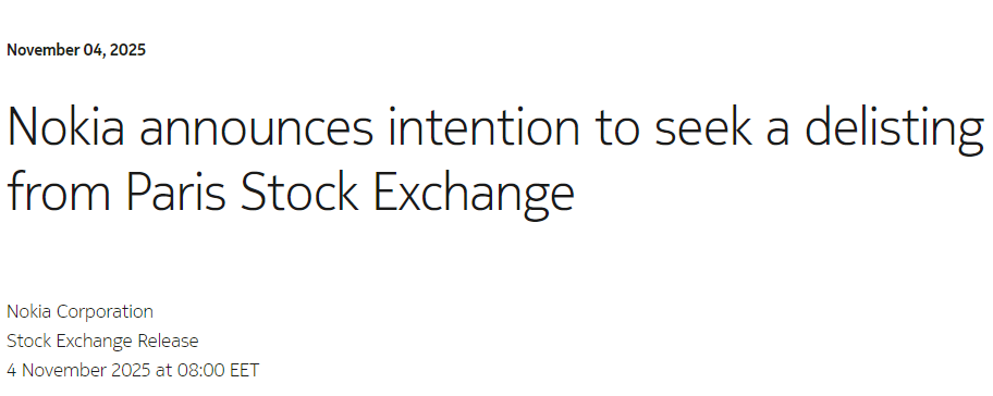 诺基亚在公告中还提到,本次从巴黎泛欧交易所退市尚需获得该交易所董事会的批准。若获批,预计退市将在未来三个月内生效。