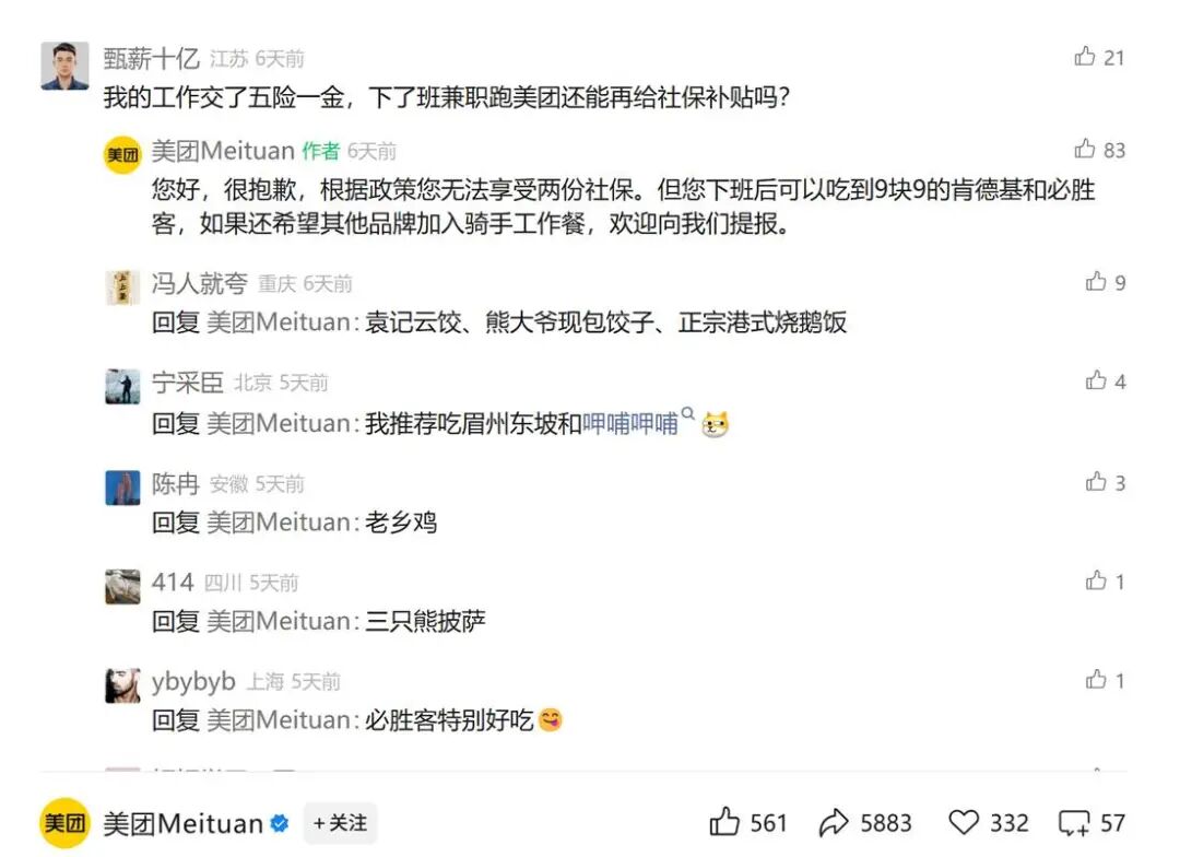 在美团宣布参保补贴全国覆盖的推文下,评论区有网友询问,已经有工作能否领补贴,美团回复按照政策无法享受两份社保,但是下班后可以吃到9块9的肯德基和必胜客,如果还希望别的品牌加入“骑手工作餐”,欢迎提报。