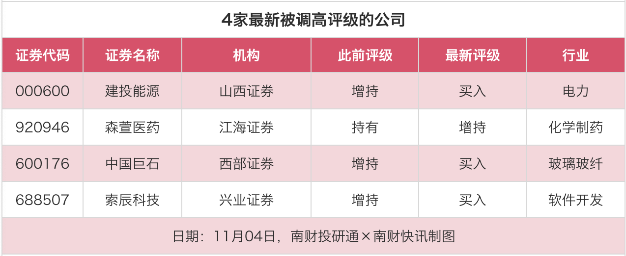 评级调高方面,11月4日,券商调高上市公司评级为4家次,最新数据包括了山西证券对建投能源的评级从“增持”调高至“买入”,江海证券对森萱医药的评级从“持有”调高至“增持”,西部证券对中国巨石的评级从“增持”调高至“买入”。