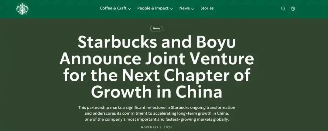 今天(2025年11月4日),星巴克宣布与国内顶级私募、中国另类资产管理公司博裕投资达成战略合作,双方将成立合资企业,共同运营星巴克在中国市场的零售业务。