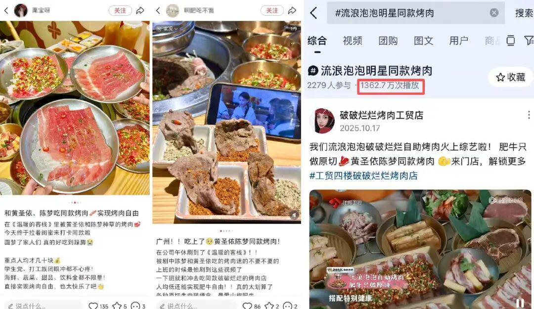 节目播出后,市场反响立竿见影,#流浪泡泡明星同款烤肉话题量破千万。武汉、南京、广州等多个城市的流浪泡泡门店,迅速掀起 “明星同款烤肉” 打卡热潮,不少消费者专程到店体验。许多年轻人在社交平台分享:“吃上了黄圣依陈梦同款烤肉!”“实现烤肉自由,好吃到跺脚”......