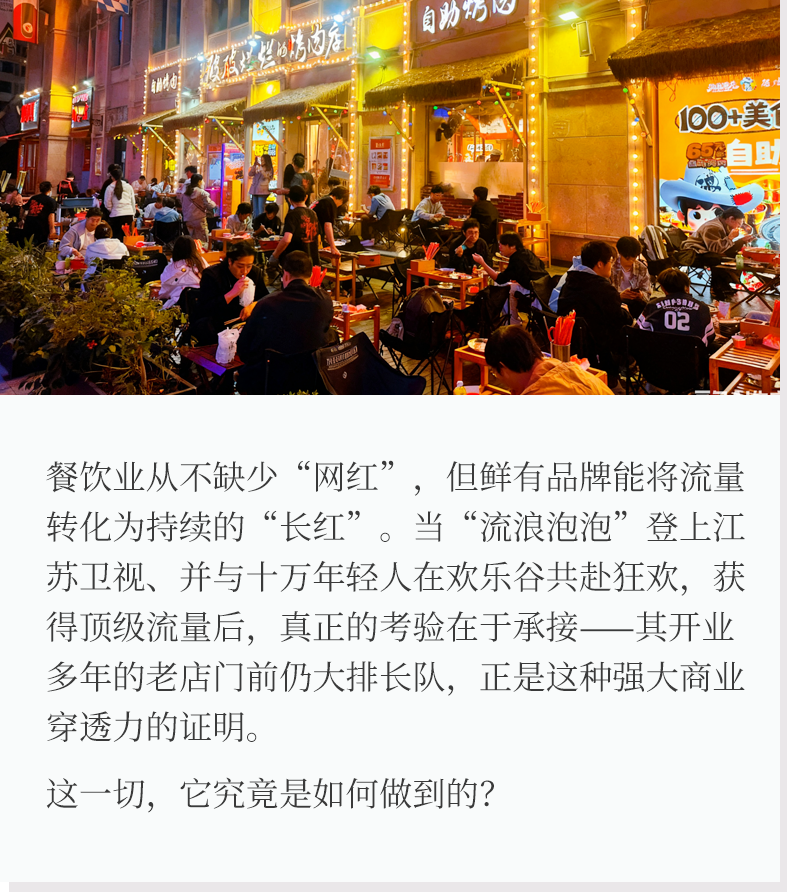 从此前的广州直营店单日千人取号,试营业首日便登上大众点评“广州烤肉自助热门榜”榜首;到南京首店开业排队8小时刷屏社交平台;再到“明星同款烤肉” 打卡热潮,全平台亿级流量的持续发酵,流浪泡泡的市场热度持续攀升。