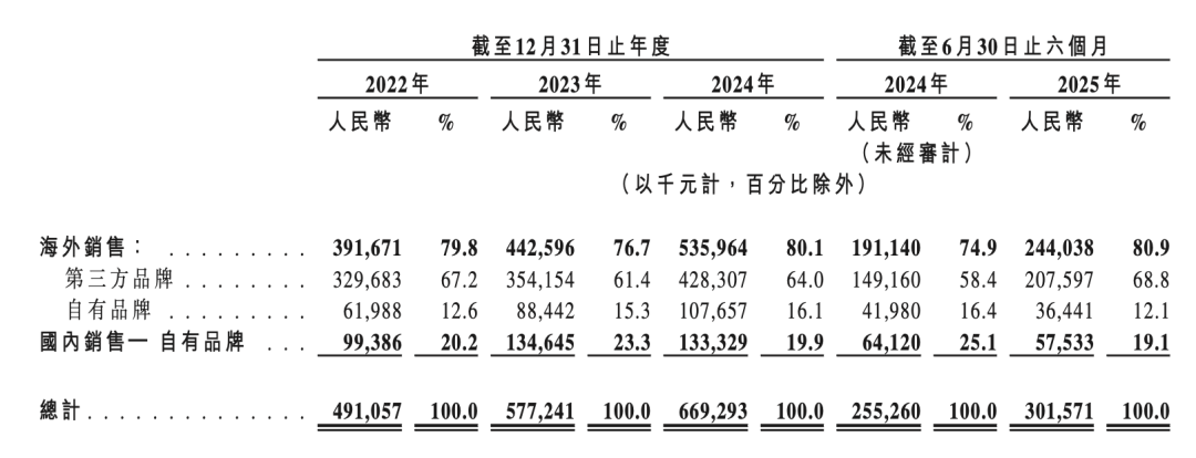 2022年-2024年以及2025年上半年,公司来自海外销售的收入分别为3.92亿元、4.43亿元、5.36亿元及2.44亿元,占同期总收入的79.8%、76.7%、80.1%及80.9%。