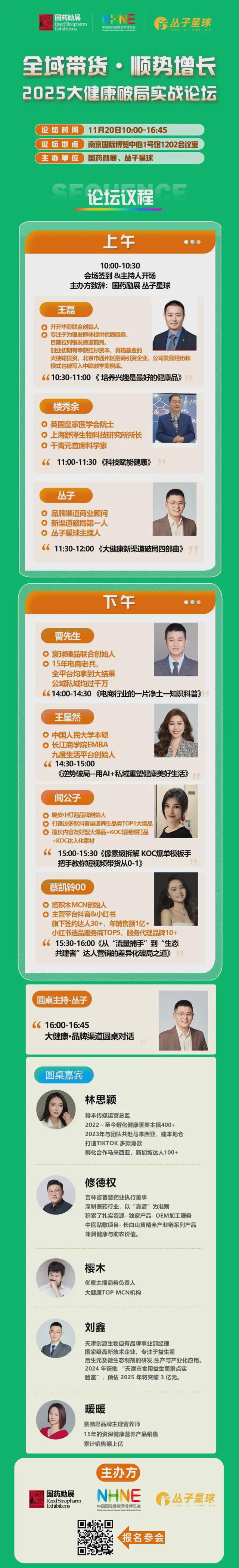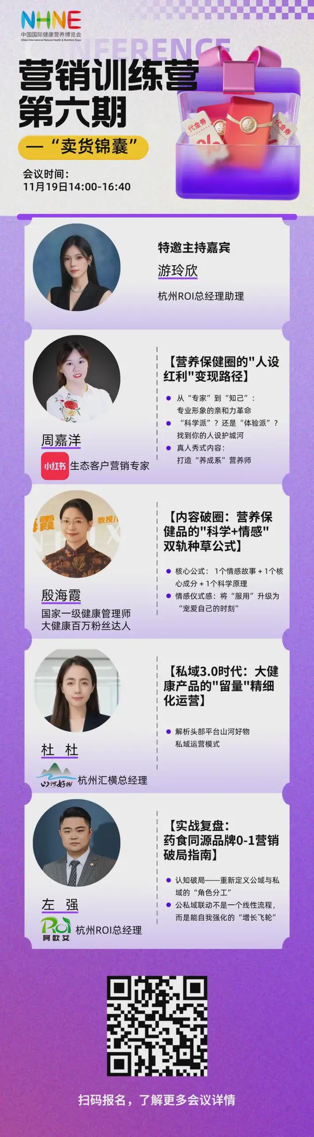 为切实提升年末营销实操能力,重磅推出"知识盛典"系列活动,包含"营销训练营第六期:卖货“锦囊”"与"2025大健康带货电商峰会"两大板块,邀请拥有10年以上健康营养行业营销经验的操盘手、各主流平台健康营养类目负责人,帮助企业快速掌握电商带货的核心技能,实现年末销售业绩的跨越式增长。