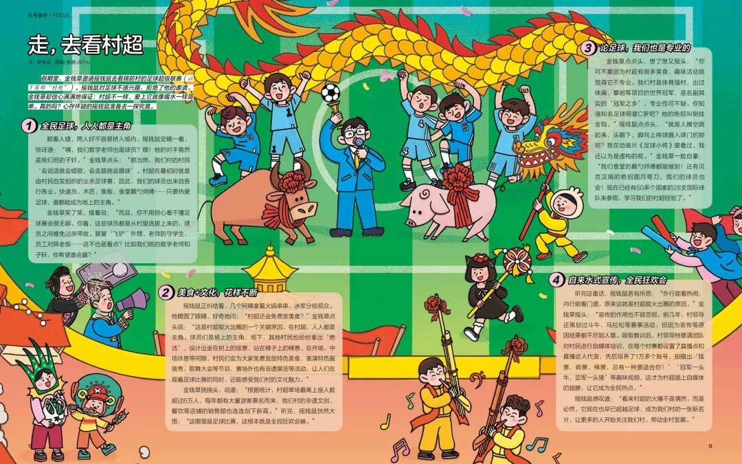 快递员、木匠、食堂师傅变身足球选手,舅舅“飞铲” 外甥、老师对阵学生的趣味场面,还有免费送火锅串串、非遗展览同步上演 —— 这哪里是足球赛,分明是一场全民参与的 “乡村商业狂欢”!杂志里不仅还原了村超单场 6 万人上座的热闹场景,更拆解了它 “火出圈” 的关键:从 “挂票、梯票” 的创意营销,到 1 万多个村民自媒体账号的 “自来水宣传”,让孩子看懂 “热爱” 如何变成带动全村增收的 “财富引擎”。更惊喜的是,村超球员还能复刻 C 罗的 “倒挂金钩”,连 50 多个国家的球队都来取经,专业与趣味并存,看得人热血沸腾!