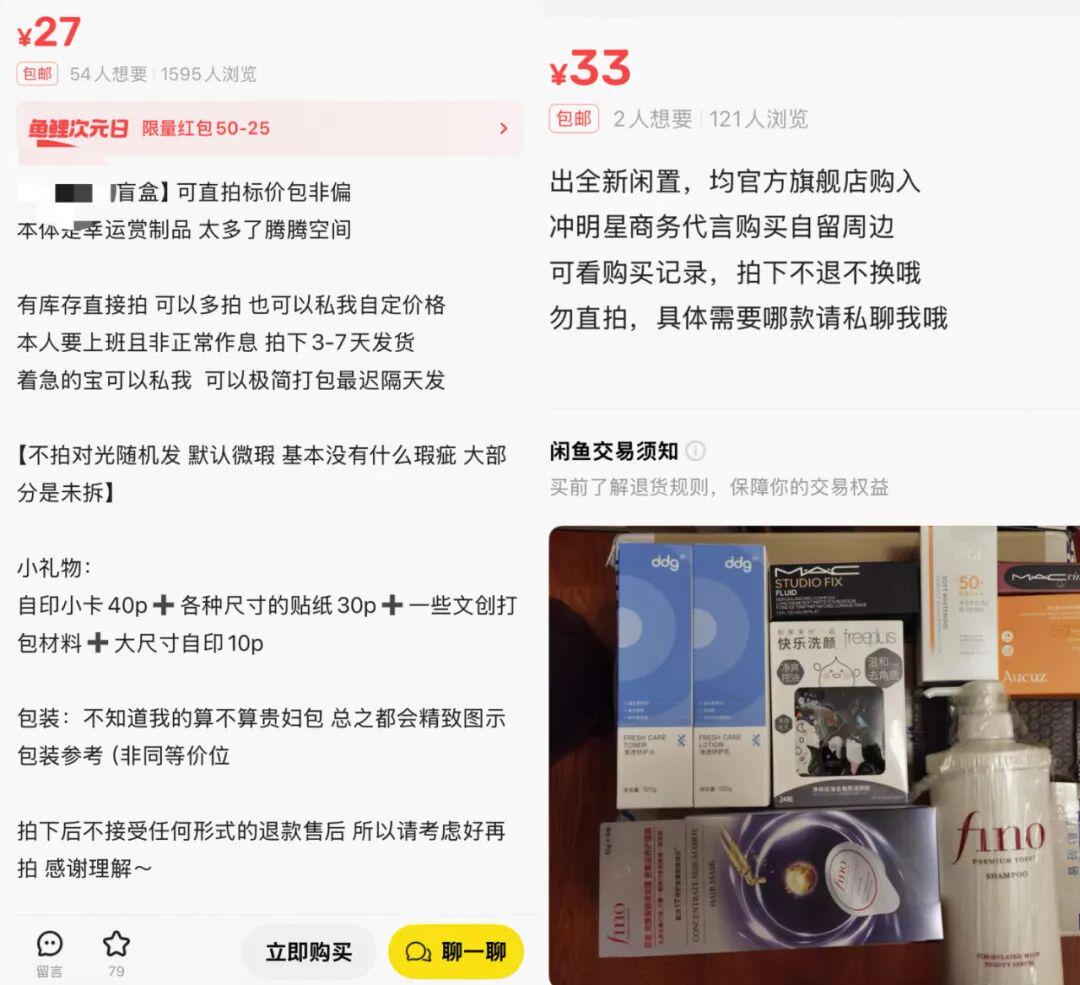 他们在闲鱼上寻找明星粉丝转让未拆封的周边礼盒,或者委托有员工折扣的商场柜哥柜姐代购捡漏。