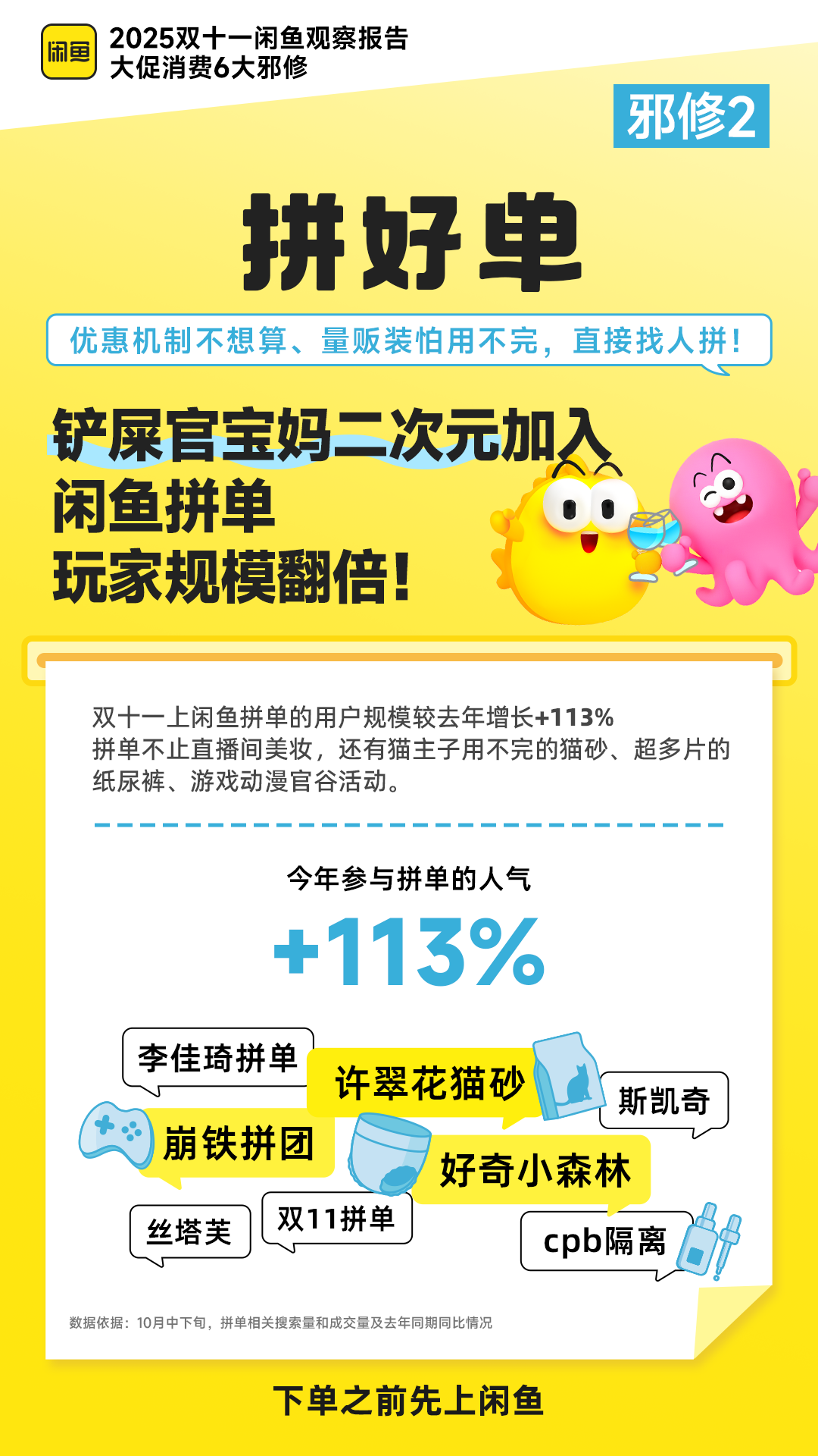 报告数据显示,闲鱼拼单玩家规模翻倍,铲屎官们拼猫粮,宝妈们拼尿片,二次元同好们拼手办模型。这种自发组织、按需分配的行为,形成了一种关于“如何轻盈参与大促”的搭子模型。