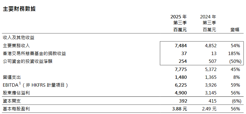 2025年第三季度,香港交易所实现收入及其他收益为77.75亿港元,同比增长45%;股东应占溢利为49亿港元,同比增长56%。香港交易所提到,主要业务收入较2024年第三季上升54%,源于现货市场成交量创新高,使交易及结算费增加。