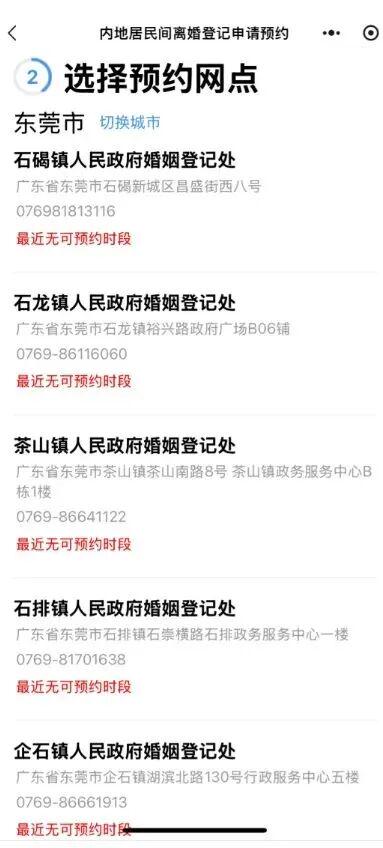 近日,有网友发帖称,想在东莞办理离婚登记,但系统显示,多个婚姻登记处最近无可预约时段。该帖引发关注,已有上千条评论。