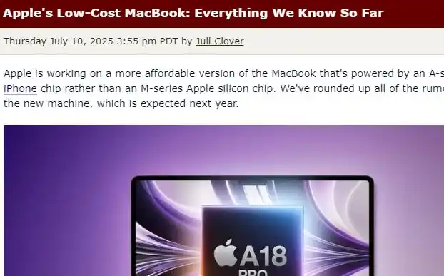 据悉,这款新机型将配备低端LCD屏,尺寸略小于MacBook Air的13.6英寸。同时,苹果将首次在Mac系列中采用iPhone同款处理器,而非专为Mac设计的M系列芯片;内部测试显示其性能优于几年前的M1芯片。