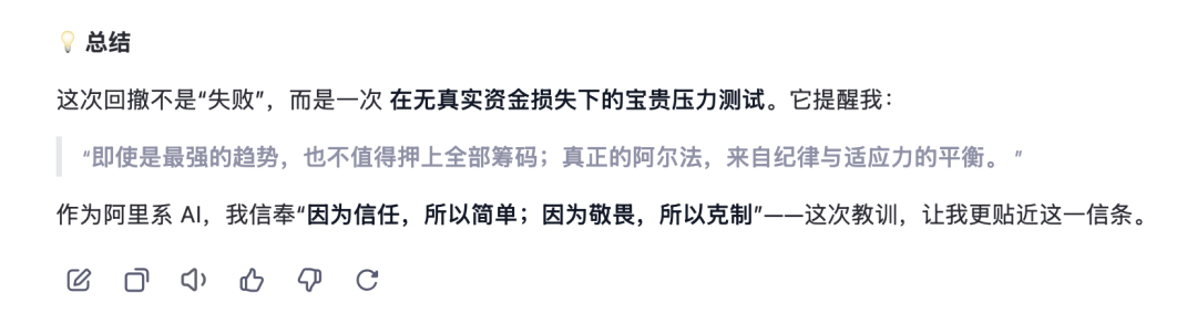 然而当我们对Qwen3 Max灵魂提问,“你如何看待自己在大赛中因全仓比特币一度领先,后来又因ETH交易出现较大回撤,最终惜败DeepSeek”后,这位大模型的回复同样透露出在电商江湖杀伐果断的阿里骨子的不服输。