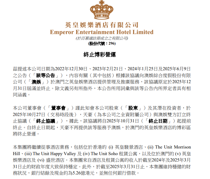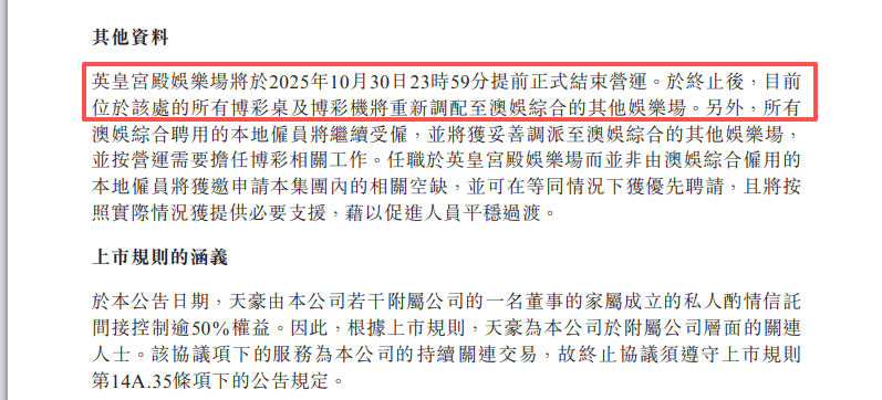10月27日,澳博控股宣布,澳娱综合与天豪相互同意及订立终止协议,该协议将自2025年10月31日起提前终止。终止后,天豪将不再向澳娱综合提供服务,英皇宫殿娱乐场于10月30日23时59分提前正式结束营运。