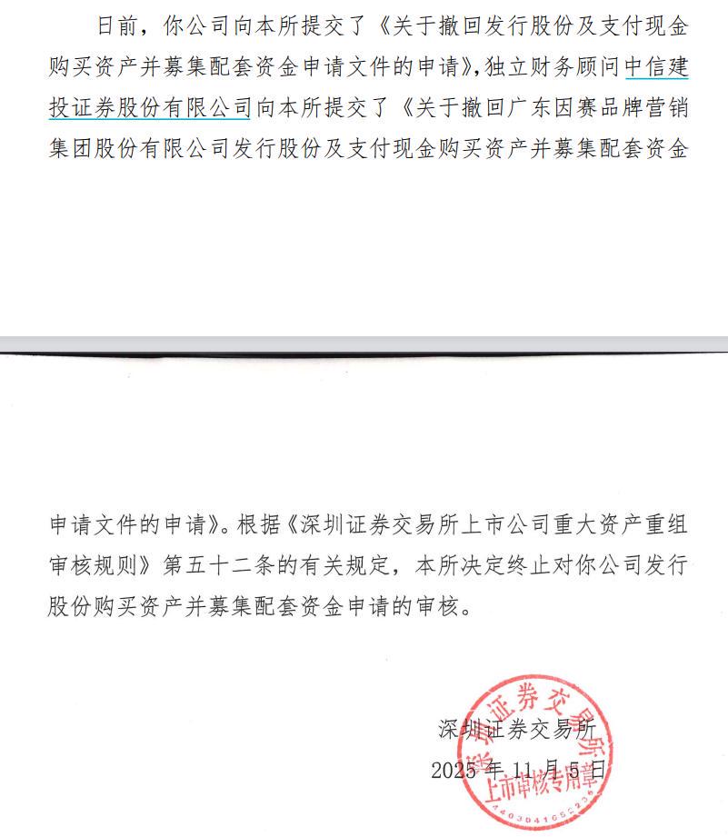 深交所称,于2025年6月30日依法受理了因赛集团发行股份购买资产并募集配套资金申请文件,并依法依规进行了审核。日前,因赛集团提交了《关于撤回发行股份及支付现金购买资产并募集配套资金申请文件的申请》,独立财务顾问中信建投证券股份有限公司提交了《关于撤回广东因赛品牌营销集团股份有限公司发行股份及支付现金购买资产并募集配套资金申请文件的申请》。根据有关规定,决定终止对因赛集团发行股份购买资产并募集配套资金申请的审核。