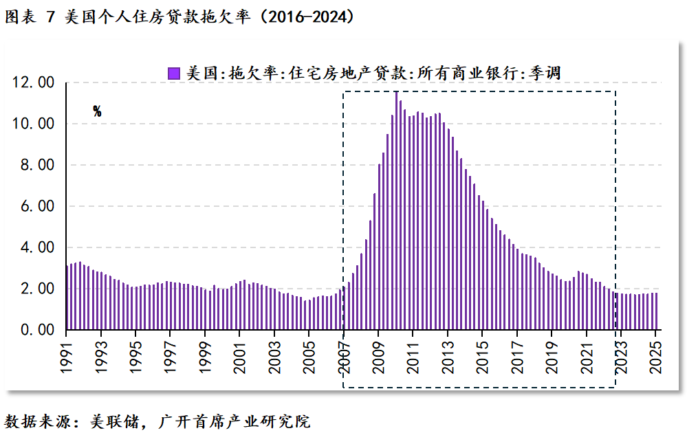 在房价持续存在较大下行压力之下,个人按揭贷款有较大范围违约的潜在风险。参考全球主要房地产市场的历史运行规律,个人住房贷款不良/拖欠率通常具有典型的尾部风险特征。即随着房价的持续下跌,个人存量住房贷款不良率将逐渐上升,尤其是在房价下跌的尾部阶段,个人住房贷款的不良率可能以指数化方式陡然升高。以美国为例,在次贷危机时期,个人住房贷款拖欠率从2007年前2%左右的平均水平大幅攀升,2009~2012年拖欠率在10%以上(见图7);直到2022年6月,该指标才回到2%以内。香港在1998年爆发金融危机后,按揭贷款拖欠比率快速飙升至原有水平的十倍以上。类似的情况在上世纪九十年代日韩都发生过。尤其当存量房价距离历史高点持续累计跌幅接近或者超过50%以上后,个人住房违约风险可能集中爆发。尽管我国购房首付比例较高,相对发达国家有较高的安全垫,如果未来一个阶段我国商品房价格持续下跌30%甚至更高,居民部门住房贷款违约风险仍可能大幅上升。而居民部门住房贷款从爆发危机到回归安全水平可能需要消耗10~15年的时间,对市场的健康运行带来很大的负面压力。