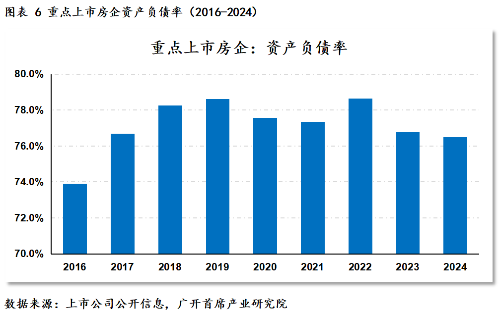 房企存量债务“尾部风险”压力犹存。商业银行未来持续增加对房企信贷支持依然存在难度。房地产销售的持续下滑对房企营收仍有负面影响,进而可能导致部分开发商资信评价的调降。长期持续高负债率增加房企还本付息压力。尽管住房金融政策对维持部分房企流动性给予了必要的支持,但当前主要的上市房企资产负债率仍然在75%~80%的高负债压力水平之上(见图6),每年仍将至少有15%~20%的资金用于还本付息,由此带来的房企现金流压力仍然偏紧。除非针对房企出台大规模债务出清的专项政策,否则在房地产中长期下行周期中,即便是经营比较稳健的公司也可能会因为暂时性的资金周转问题而被迫出现债务违约或付息困难的情况。