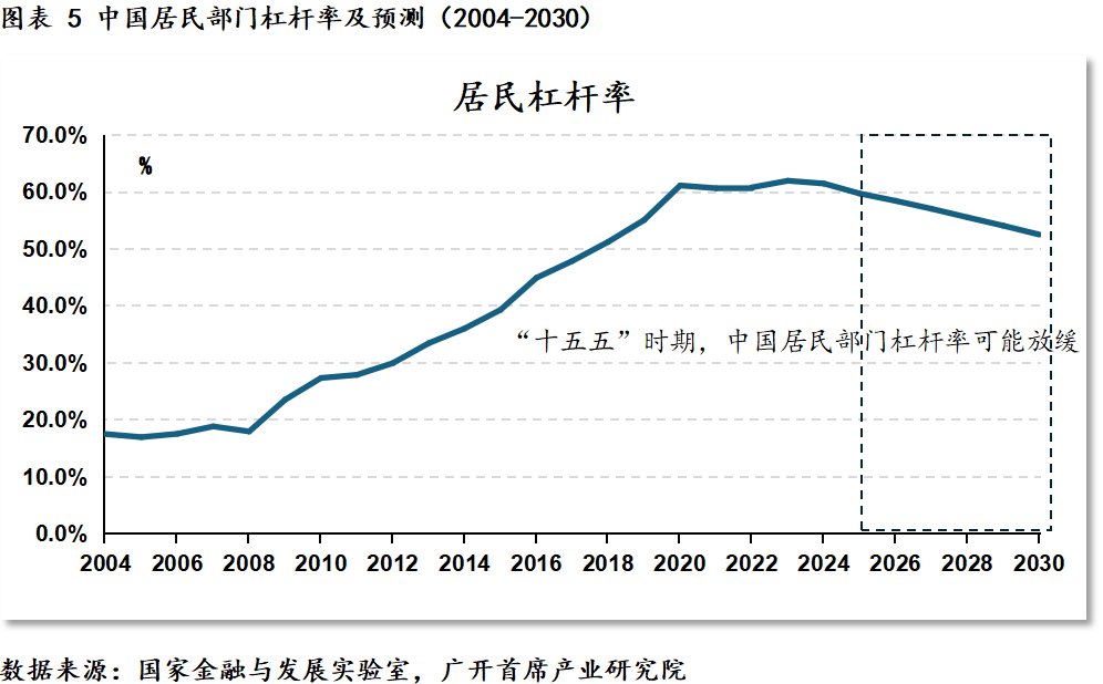 居民部门杠杆率达峰值后逐步走低。由于住房需求释放节奏进一步放缓,新增个人按揭贷款仍然可能负增长。假设未来一个时期,中国GDP增速保持在4.5%左右,住户贷款增速保持在2%左右的增速,居民个人住房贷款增速按照(2022~2025年,剔除疫情影响)平均-0.6%的增速计算,预计到“十五五”末期,个人住房贷款占居民贷款的比例将从“十四五”末期的45%降至40%,居民部门杠杆率将从61%左右的水平降至54%(见图5)。居民部门杠杆率下降与全球发达经济体房地产运行周期的规律相吻合。由于居民部门存量债务处于相对偏高的水平,居民部门为了减轻偿债压力,减少房产购置和进行存量债务提前偿还是主要的选择方式;而居民信贷增速低于GDP增速,居民部门杠杆率将自然回落。长期来看,居民部门杠杆率的回落将有助于提升居民部门潜在的购房能力。