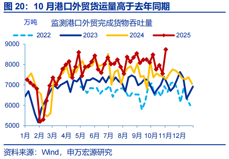 出口:10月中美关税一度再生波折,“抢出口”或再支撑10月出口。10月10日美国威胁自11月起对中国所有商品加征100%关税,预期关税政策加码或再度引发对美“抢出口”。考虑到企业发货到报关出口存在时滞,10月最后一周港口外贸货运量出现冲高现象,同比较前周上行18pct至20%,或反映“抢出口”现象。并且出口链生产只衡量当期生产、本月更多受到高库存约束;而港口外贸货运量还包括存货用于出口。当期生产回落,但存货仍可用于出口,因此10月港口外贸货运量并不弱。加之9月加工贸易进口同比回升(+6.6pct至12%),10月出口同比预计维持韧性(7%)。