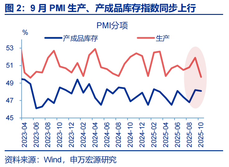 供给:10月工作日天数减少叠加库存走高,可能共同对生产形成约束。10月制造业PMI较前月-0.8pct至49%,结构上生产指数降幅大于新订单。一方面,10月工作日天数仅18天、同比较前月减少3天,对供给拖累较大。另一方面,前期制造业存在“补库存抢生产”现象,高库存对10月供给也有较大约束;高炉、PTA开工等指标也指向供给本月或有走弱,出口链生产也呈更弱表现。