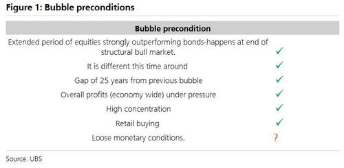 瑞银股票策略师Andrew Garthwaite及其团队在报告中提出,市场泡沫的形成通常需要满足七个前提条件。他们认为,如果美联储的降息路径与瑞银的预测一致,那么所有七个条件都将被触发。