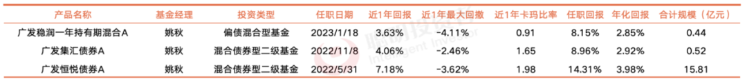 据Choice统计,姚秋目前在管基金6只,其中单独管理的“固收+”基金有4只,其中广发稳信6个月成立不满1年。截至2025年10月31日,广发恒悦(A/C类:010449/010450)自2022年5月31日管理以来,任职总回报14.31%,今年以来的收益为6.15%。