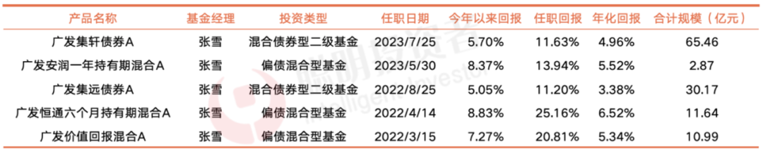 目前,张雪在管5只基金,以二级债基和偏债混合型为主。