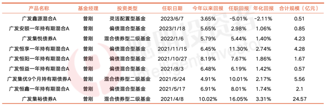 据Choice统计,曾刚目前在管基金9只,以二级债基和偏债混合型基金为主。
