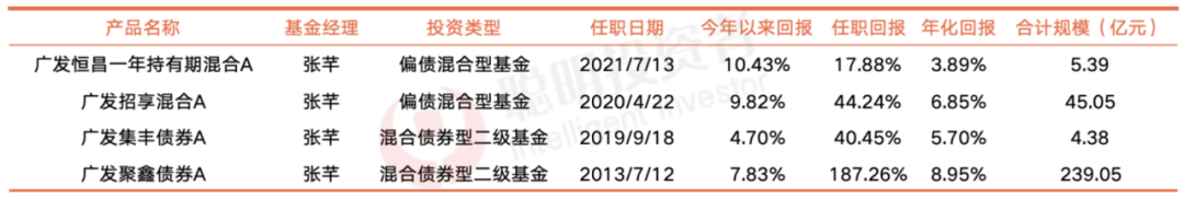 据Choice统计,张芊目前在管基金8只,其中单独管理的基金有4只,分别是广发聚鑫、广发招享、广发集丰、广发恒昌一年持有期。