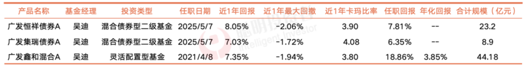 据Choice统计,吴迪目前在管基金8只,其中,采用“固收+”策略管理的产品有3只,分别是广发鑫和、广发恒祥和广发集瑞。
