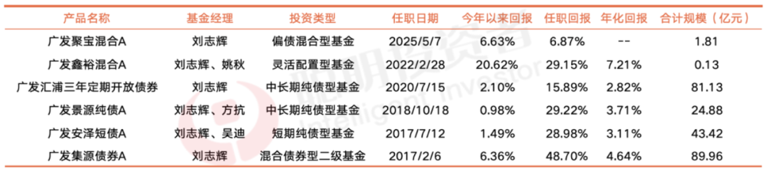 据Choice统计,刘志辉目前在管基金6只,其中单独管理的“固收+”基金有广发集源、广发聚宝。