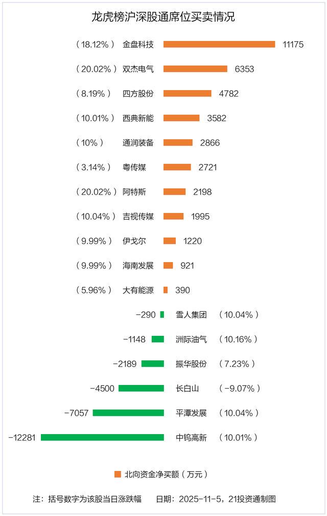 11月5日,北向资金参与龙虎榜中的个股共有17只,合计净买入1.07亿元。其中沪股通净买入6 股,净卖出3 股,合计净买入1.63亿元;深股通净买入5 股,净卖出3 股,合计净卖出5547.36万元。