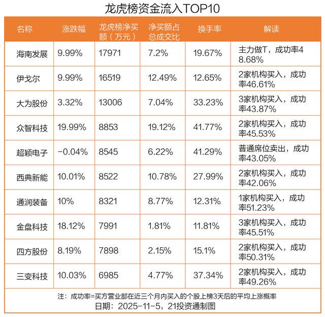 11月5日,上证指数上涨0.23%,深证成指上涨0.37%,创业板指上涨1.03%。盘后龙虎榜数据显示,共有48只个股因当日异动登上龙虎榜,资金净流入最多的是海南发展(002163.SZ),达1.8亿元。