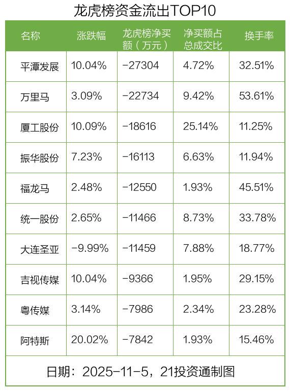 而龙虎榜中资金净流出最多的是平潭发展(000592.SZ),被净卖出为2.73亿元,占总成交金额的4.72%。平潭发展收盘上涨10.04%,换手率为32.51%。