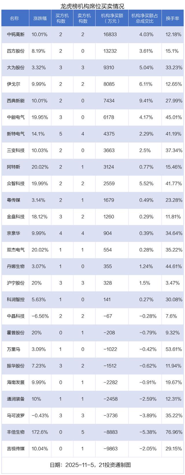 11月5日,26只个股龙虎榜出现了机构的身影,机构合计净买入5亿元。具体来看,机构净买入17股,净卖出9股。