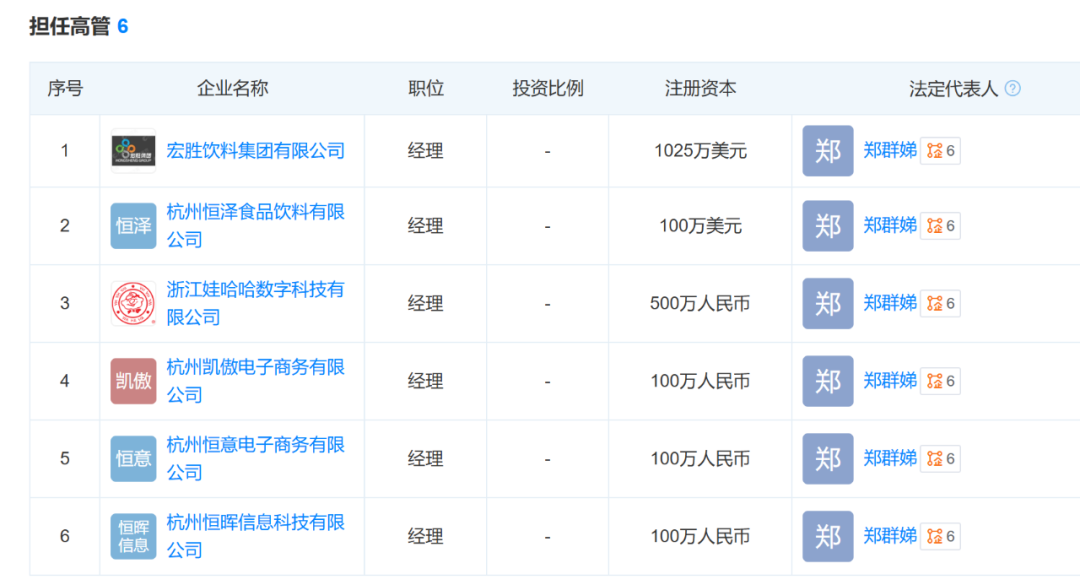 天眼查显示,郑群娣目前在6个娃哈哈相关公司担任法定代表人,并均担任经理职务。