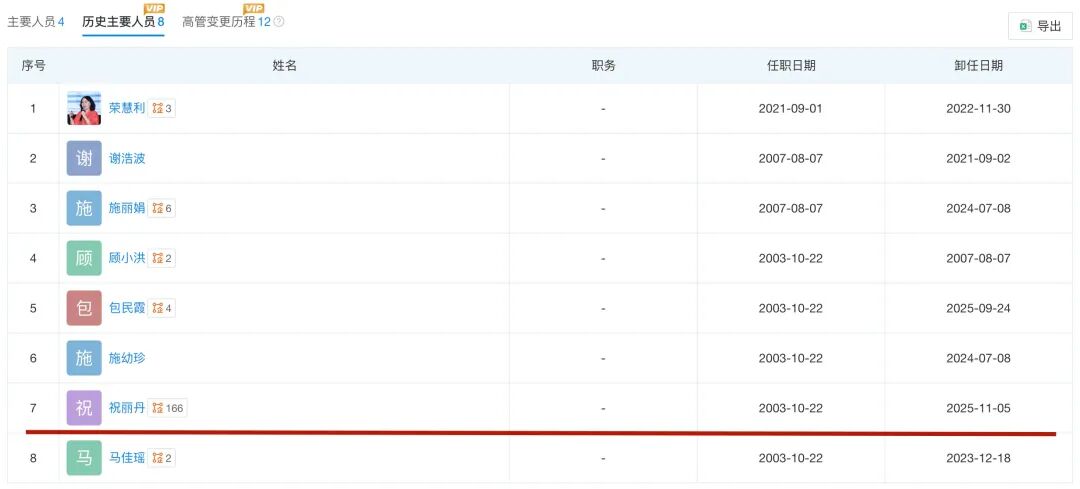 祝丽丹的名字则被转移至历史主要人员名单之列,其卸任日期显示为11月5日。
