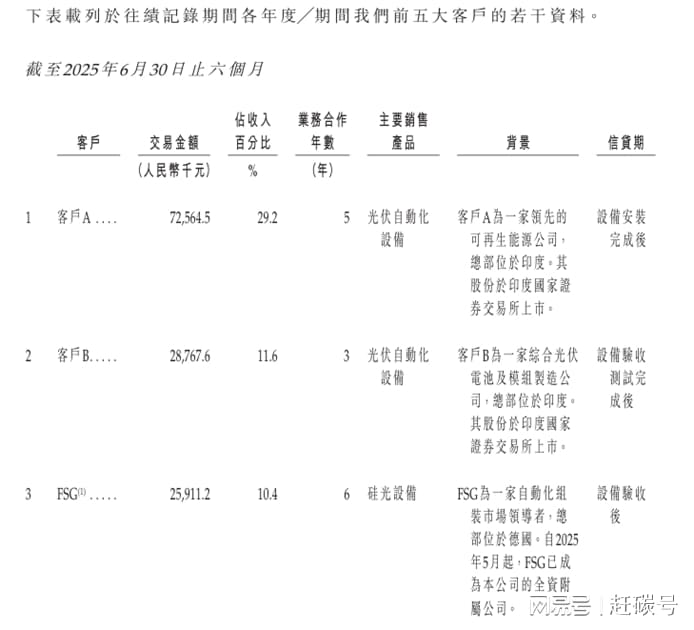 来自印度的客户A、客户B在2024年、2025年上半年,累计为公司贡献了1.89亿的销售额。罗博特科对这两个客户的信贷期分别是“设备安装完成后”与“设备验收测试完成后”。