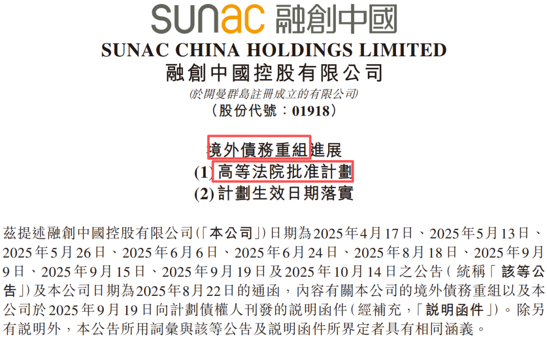 11月5日晚,融创中国发布公告,公司约96亿美元的境外债务重组获香港高等法院批准。至此,融创中国重组计划条件均已达成,成为首家境外债基本清零的大型房企。