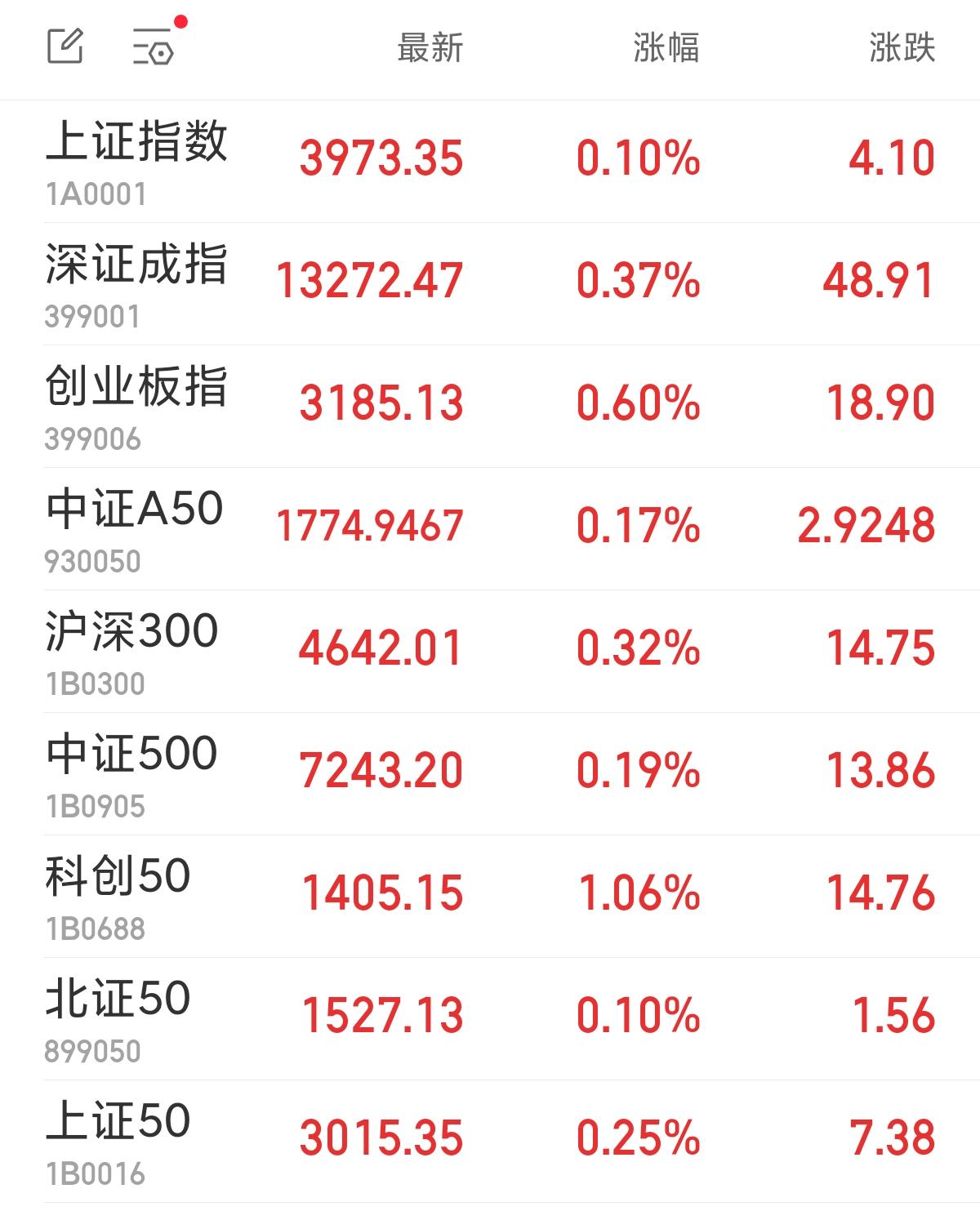 中新经纬11月6日电 周四,A股三大指数集体高开。上证指数涨0.10%,报3973.35点;深证成指涨0.37%,报13272.47点;创业板指涨0.60%,报3185.13点。