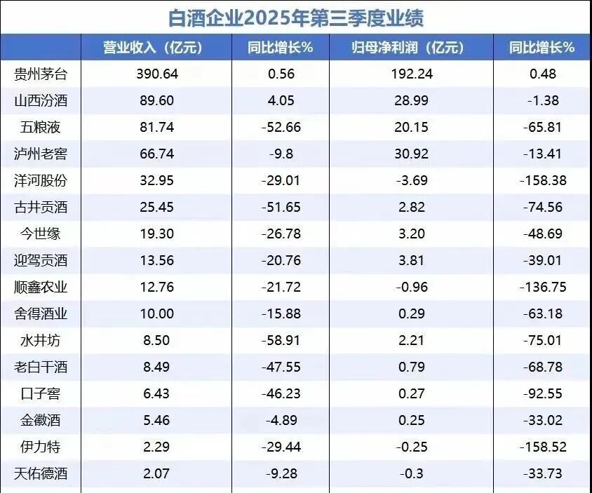 毕竟将目光放置整个行业,不难发现白酒行业第三季度的显著承压——整体营收为779.76亿元,同比下降18.47%;净利润为280.11亿元,同比下降22.22%;具体到酒企,20家白酒上市公司中仅有贵州茅台实现营收与净利润的同比微增。
