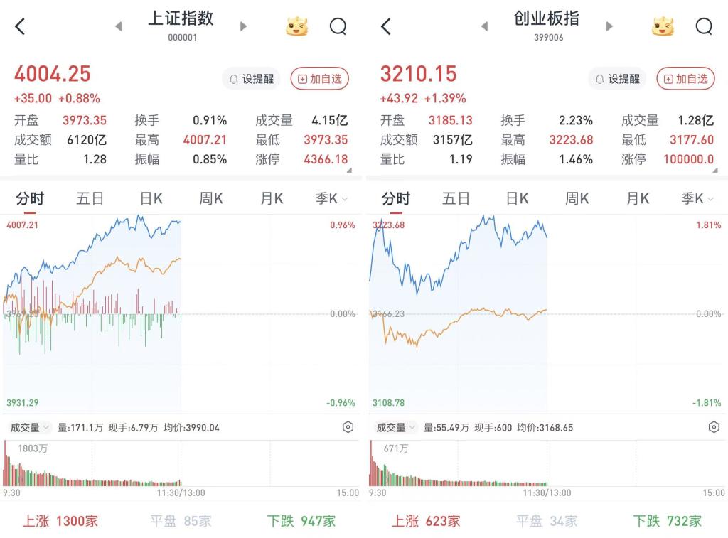 至午间收盘,上证综指涨0.88%,报4004.25点;科创50指数涨2.82%,报1429.66点;深证成指涨1.39%,报13407.3点;创业板指涨1.39%,报3210.15点。