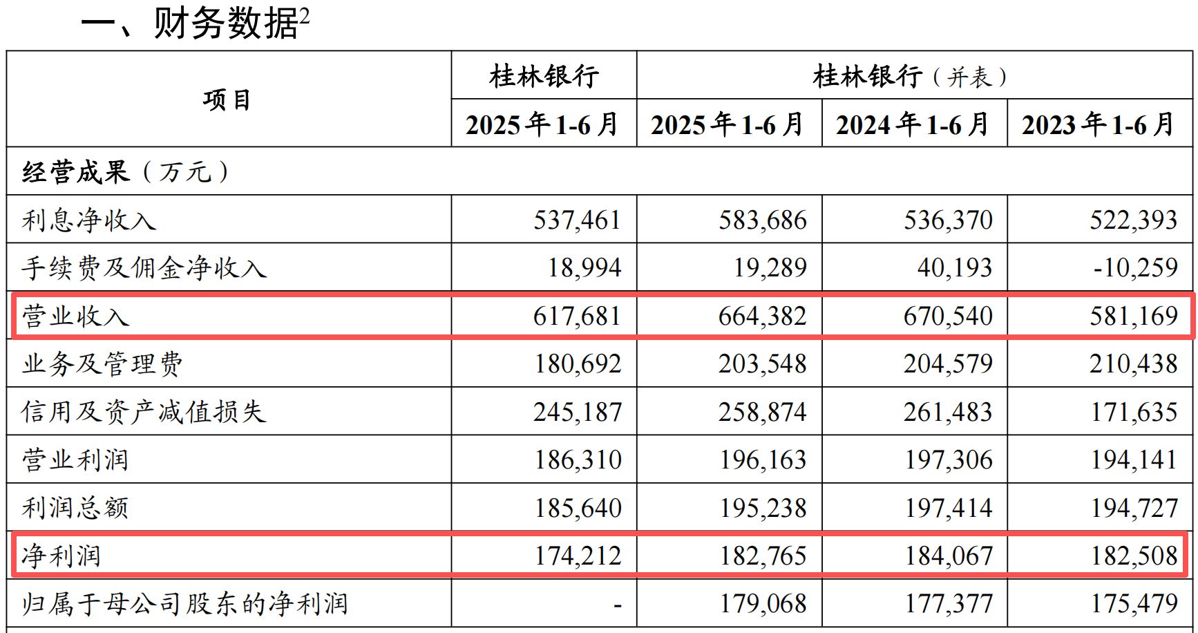 2025年上半年,桂林银行营收利润双降,期内实现营业收入66.44亿元,比去年同期减少了约0.61亿元;实现净利润18.28亿元,同比下降0.71%。时间线拉长,不难看出桂林银行业绩增速放缓的现状。