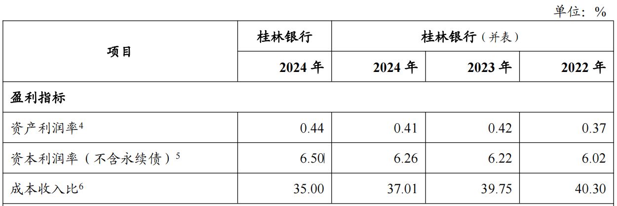 需要注意的是,桂林银行的资产利润率和资本利润率均未达到监管要求。2021年-2024年,桂林银行的资产利润率分别为0.35%、0.37%、0.42%、0.41%,资本利润率分别为6.46%、6.02%、6.22%、6.26%。两者常年低于0.6%、11%的监管红线,折射出桂林银行盈利能力的薄弱。