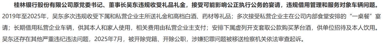 2025年9月30日,桂林银行原党委书记、董事长吴东被桂林市纪委监委通报。公开信息显示,2019年至2025年,吴东多次违规收受下属和私营企业主所送的礼品礼金,接受可能影响公正执行公务的宴请,违规借用管理和服务对象车辆,虚列开支套取公款购买茅台酒。目前,吴东已经被采取“双开”措施,移送检察机关依法审查起诉。