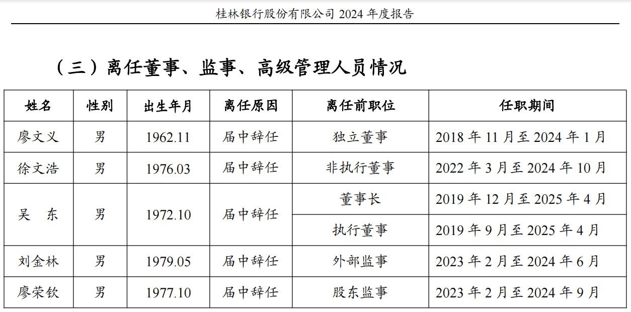 据不完全统计,2023年-2024年两年间,桂林银行已有包括吴东在内的18名董监高离任。其中,届满离任的董监高仅7名,其余皆是届中辞任。短时间内多名高管离职,对桂林银行的内部治理、战略执行、市场信心等方面难免产生一定的影响。